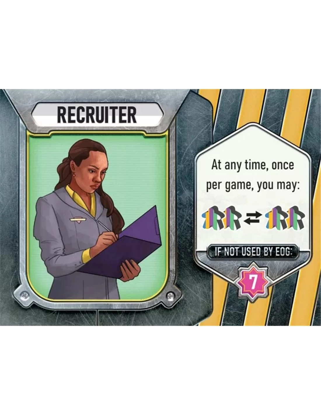 With all the different types of workers employed at the park, a Recruiter is an absolute necessity. At any time, once per game, you may exchange up to 2 of your workers for workers of any color. Gain 7 VP at the end of the game if you did not use the Recruiter’s ability.