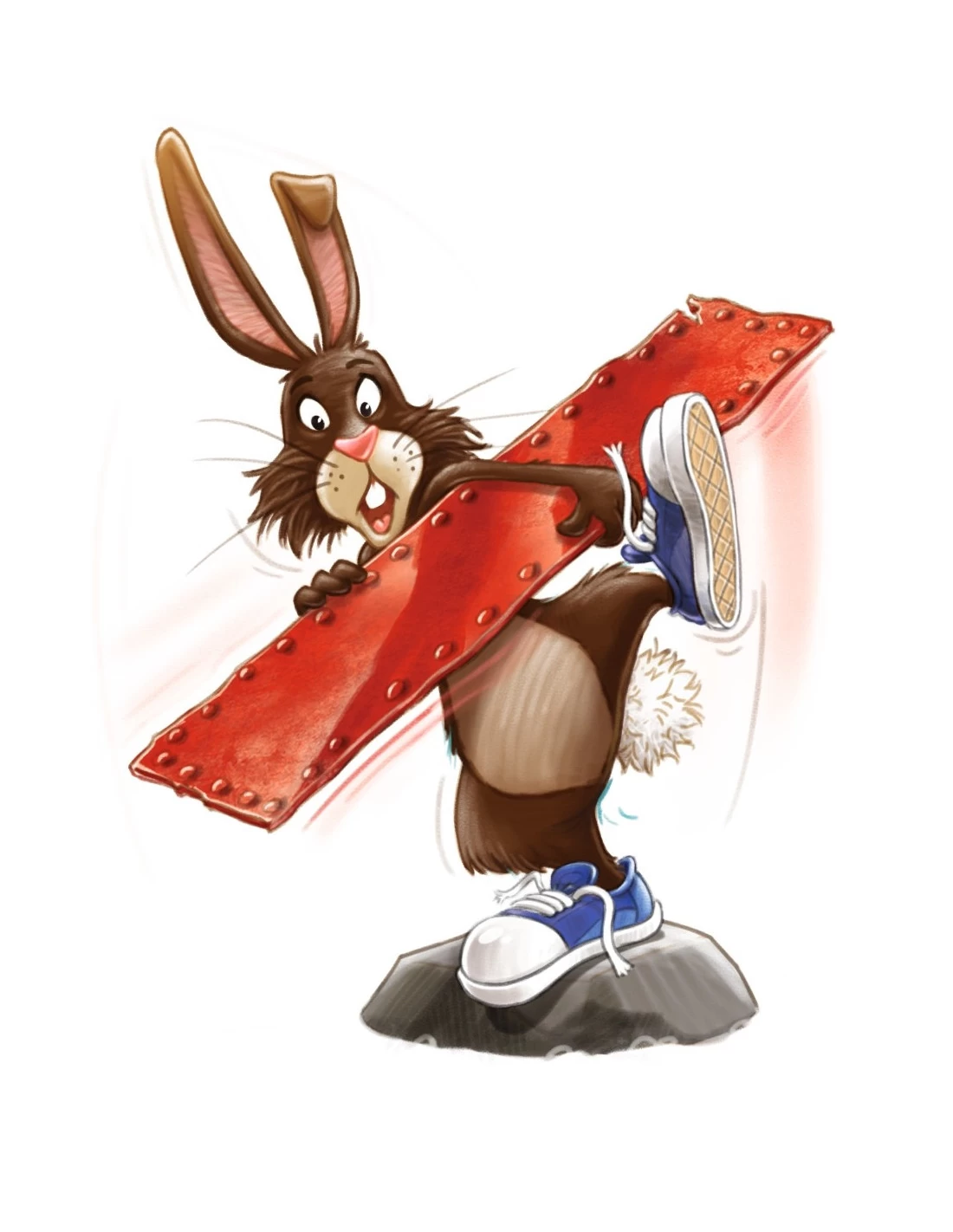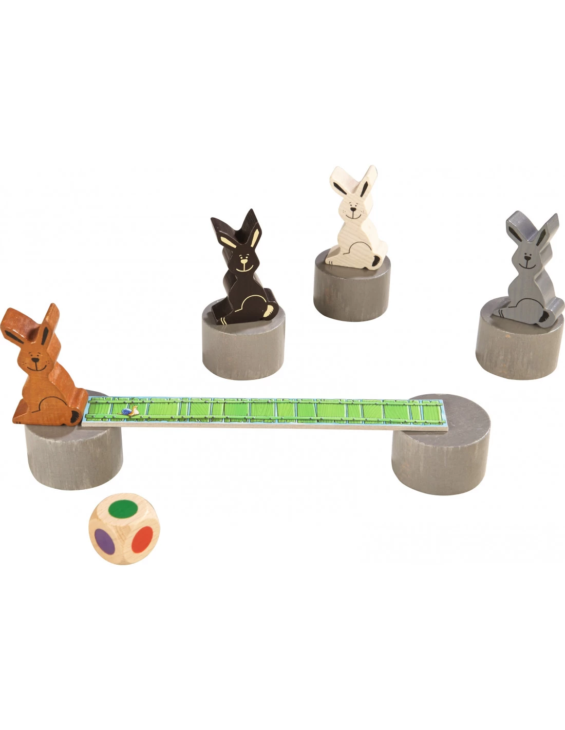 In the game, all the rabbits start on a platform, and the carrots await on another platform that players set some distance away. On a turn, a player rolls a color die, picks up the cardboard “plank” of that color, places a wooden “stone” some distance away from where their rabbit is located, then tries to place the plank so that their rabbit will be able to move onto the stone. If the player succeeds, the rabbit moves; if they misjudged where to place the stone, the rabbit stays where it is.
