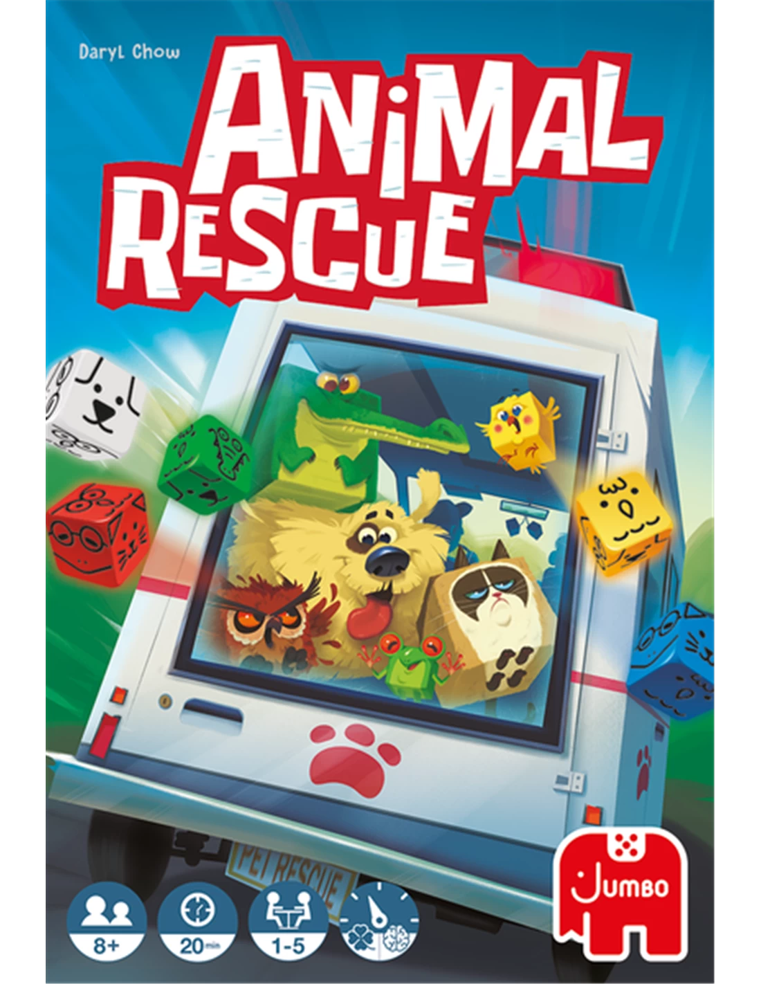 In Animal Rescue, each player takes a shelter card and a pencil. Remove one white die from the game if fewer than five players are playing.