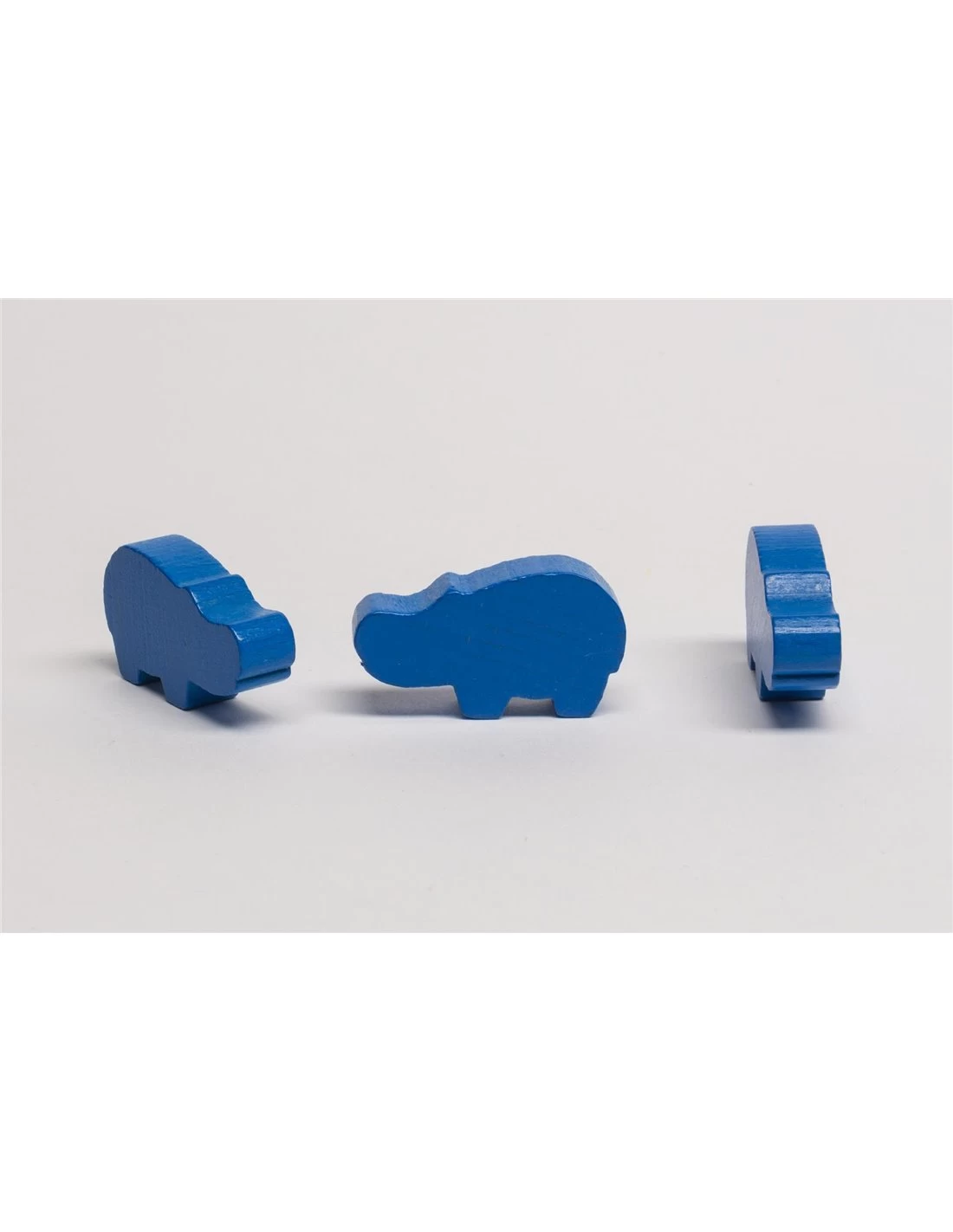Houten spelfiguur in de vorm van een blauw nijlpaard. Het dier is ca. 4 cm lang, 2,5 cm hoog en 1 cm dik,