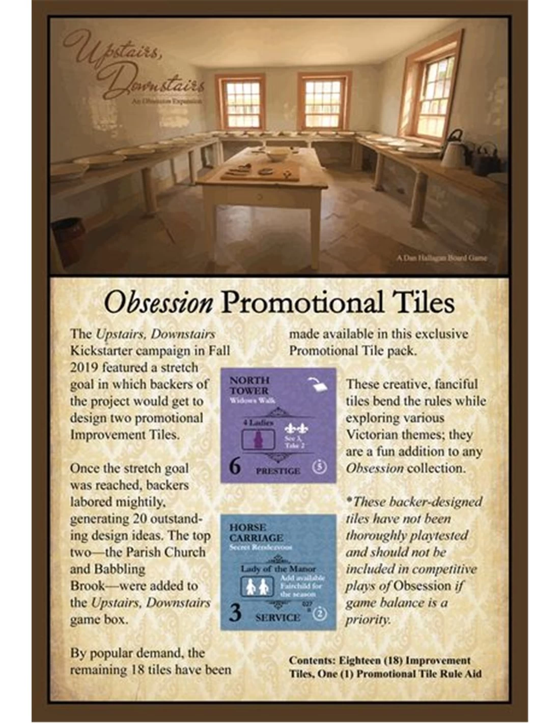 These twenty (20) promotional tiles were developed as part of a stretch goal during the 2019 Upstairs, Downstairs Kickstarter campaign.
