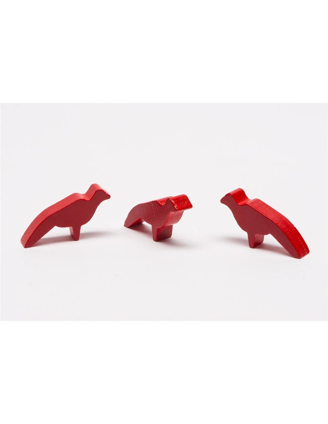 Roodgekleurde houten pauw. De pauw is 4 cm lang, 1,5 cm hoog en 1 cm dik.