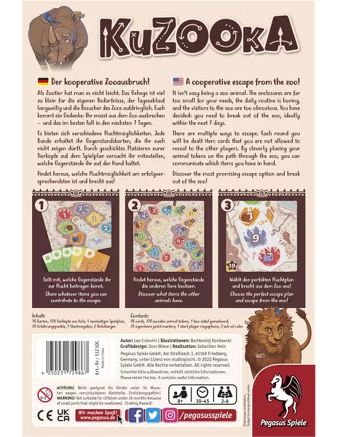 There are multiple ways to escape in KuZOOkA, but you need to work together with the other animals — in secret — to pool the trash left behind by zoo visitors and develop an escape plan that makes use of these items. Each player has one of the ten animal cards with a unique power, and you play on a game board that features a path comprised of spaces in six colors, with each space having a number in it.