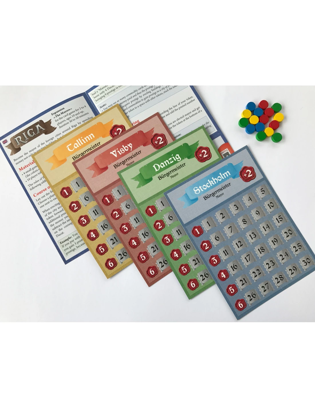 Riga: Die Bürgermeister includes four small boards and 16 tokens, four per player color. The players try to become most popular in the neighboring towns to gain additional victory points. For each building, you move your token on the board for the according town forward 1 space and additionally 1 space for each ducat you pay more than necessary. Every five spaces on the board of a town brings you 1 victory point, and the player having moved forward the most spaces becomes the mayor (Bürgermeister) and gains 2 more points.