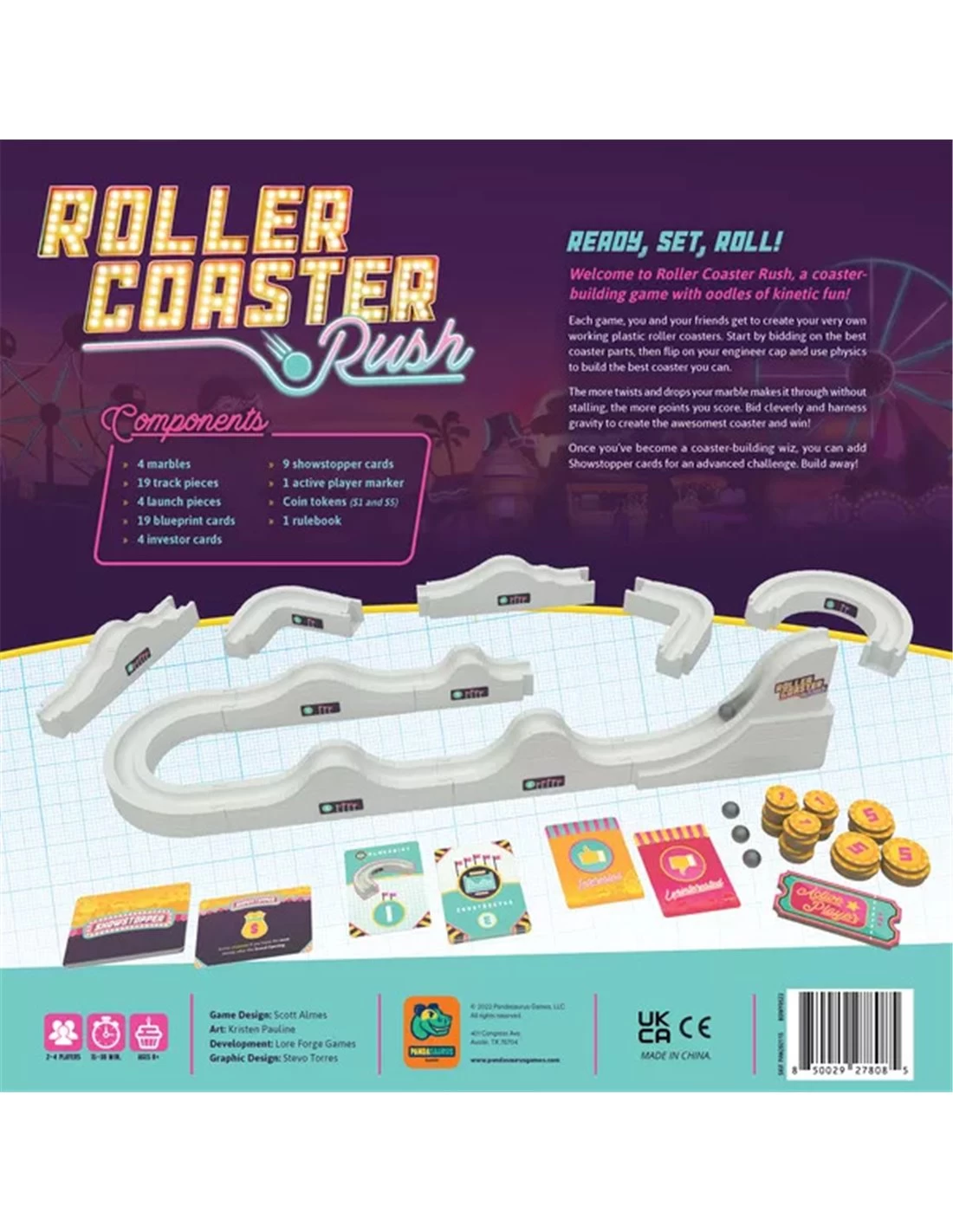 Welcome to Roller Coaster Rush, a coaster-building game with oodles of kinetic fun! Your goal is to design and construct the best roller coaster for your investors’ theme park! At the start of each game, you design a model coaster using the blueprints you have available. During the game, you’ll attempt to actually construct your model by winning auctions for the track pieces you used in your design.