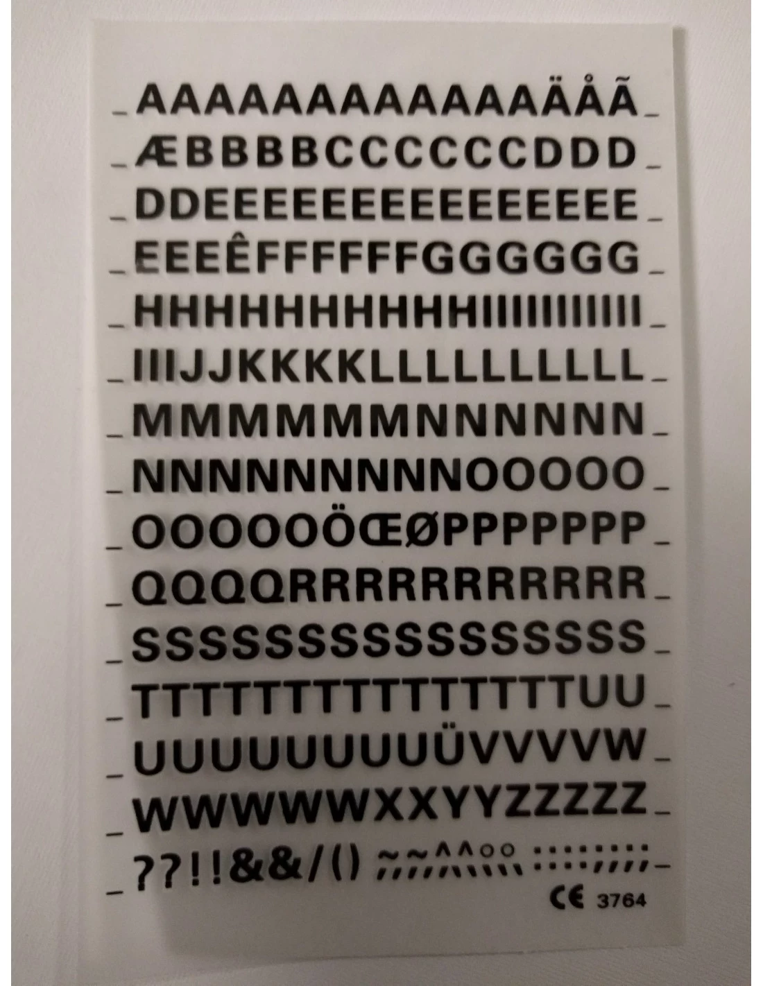 Rub-on alfabet met alleen hoofdletters en leestekens.