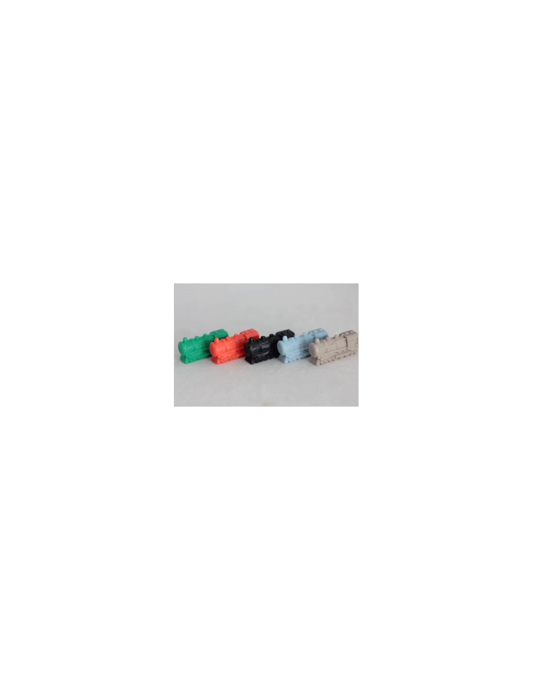 Set van 5 plastic treinen. Elke set bestaat uit een groene, oranje, zwarte, blauwe en grijze trein.