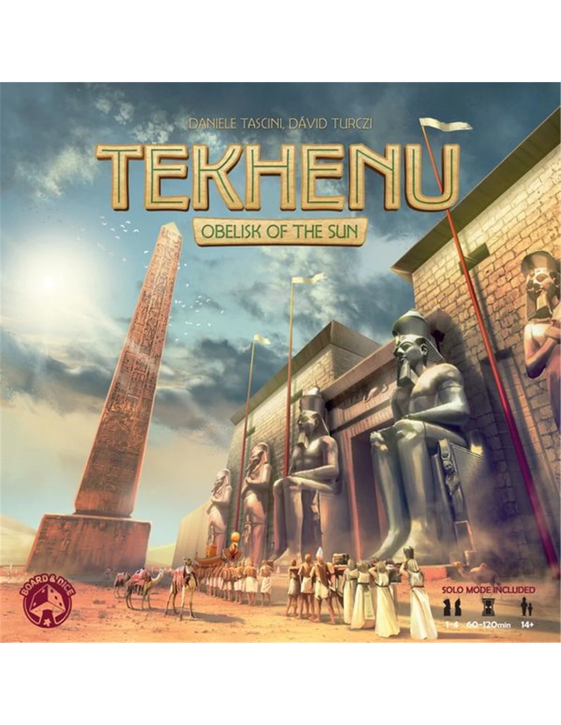 The game board in Tekhenu: Obelisk of the Sun is divided into six sections, each associated with an Egyptian god: Horus, Ra, Hathor, Bastet, Thoth, and Osiris. In the center stands an impressive obelisk (Tekhenu) that casts its shadow onto different parts of the board. As a result, the area around the obelisk is divided into sunny, shaded, and dark sections, depending on how the obelisk casts its shadow at that particular moment. As the game progresses, the sun’s rotation alters which sections are sunny, shaded, or dark.