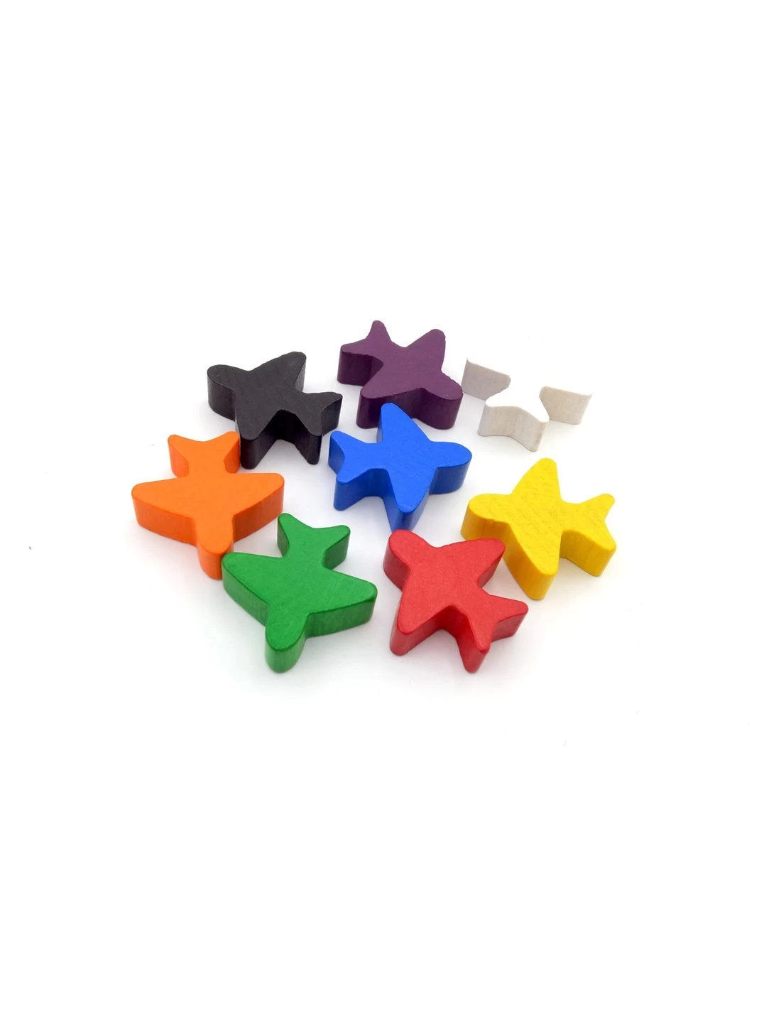 Houten spelonderdeel in de vorm van een vliegtuig. De afmetingen zijn ca. 2,5 x 2,5 cm. Verkrijgbaar in verschillende kleuren.